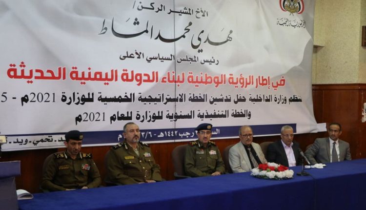 دشنت وزارة الداخلية بصنعاء اليوم الخطة الاستراتيجية الخمسية 2021- 2025م للمرحلة الثانية من تنفيذ الرؤية الوطنية لبناء الدولة اليمنية الحديثة والخطة التنفيذية السنوية للوزارة للعام 2021م.