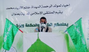 وختم كلمته بضرورة الأحتفاء برسول الله في سلوكنا وليس في أقوالنا فقط و أن لا عزة ولا نصرة لنا إلا بالإقتداء والتمسك برسول الله وأهل بيته وأن النصر هو حليفنا في القريب العاجل بإذن الله وما علينا إلا الصبر والتضحية لتحقيق ذلك وبذل أسباب النصر الذي بينها الله لنا في محكم آياته.