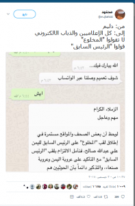 محلية تحالف العدوان يوجه وسائل إعلامه بوقف وصم “صالح “بالمخلوع Last updated ديسمبر 2, 2017 موقع طلائع المجد كشف المغرد السعودي الشهير “مجتهد ” في تغريدة له أنه تم توجيه الإعلاميين التابعين لتحالف العدوان بعدم وصف زعيم المؤتمر بالمخلوع ووصفه بالرئيس السابق في تقاريرهم مشاركة FacebookTwitterGoogle+