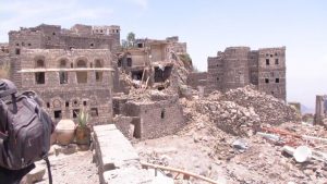 بالصور : طائرات العدوان ترتكب جريمة بحق الانسان والتاريخ في حصن مسار التاريخي