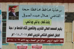 احتفل المعهد العالي للتدريب والتأهيل بمحافظة حجة اليوم الأحد بتخرج دفعة جديدة من الطلاب والطالبات من المعهد للعام الدراسي 2017 – 2018 والتي تم تسميتها بدفعة الشهيد الرئيس الصماد.