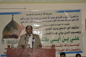 جدد الأمين العام للملتقى الإسلامي تأكيده بأن الانتماء إلى الإمام علي (ع) والإمام زيد (ع) وجميع أئمة أهل البيت (ع) والانتماء إلى منهجيتهم يجب أن تطبق في الواقع العملي وأنه يجب أن يتحرك الجميع لدفع الظالمين وأطرهم على الحق أطرى كما قال النبي (ص) وآله مشيرا إلى أن الشعب اليمني اليوم يواجه أئمة الكفر أمريكا وإسرائيل وبريطانيا وعملائهم في المنطقة .
