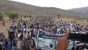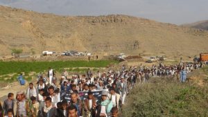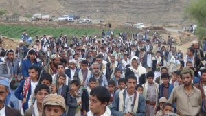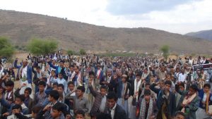 بالصور ” أبناء مديرية المفتاح يخرجون في مسيرة شعبية تنديدا بجرائم العدوان وإعلان للنفير العام