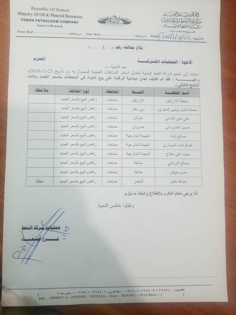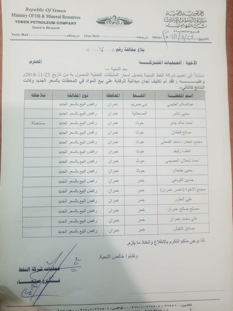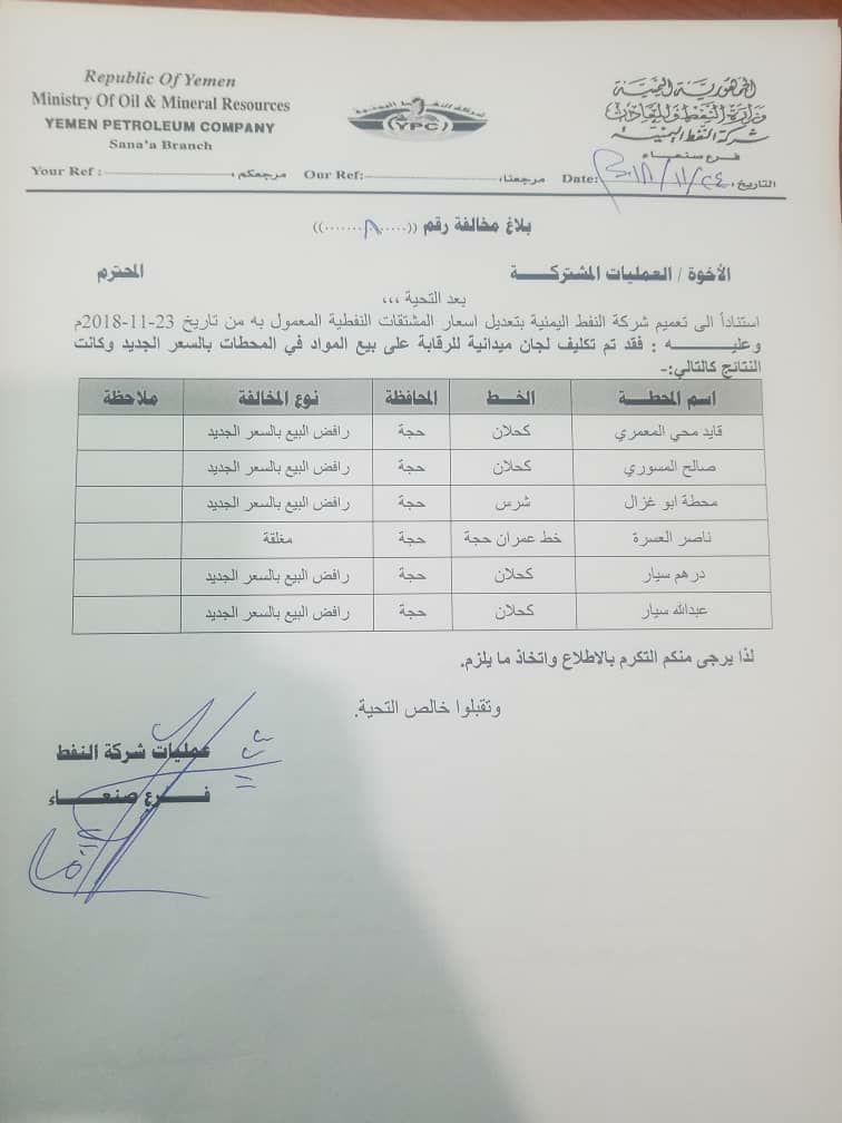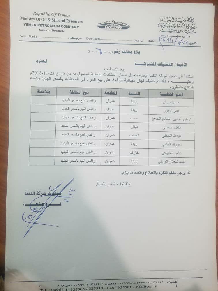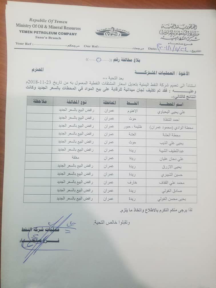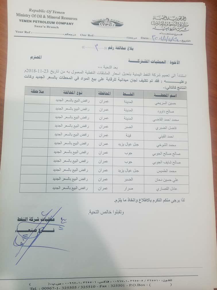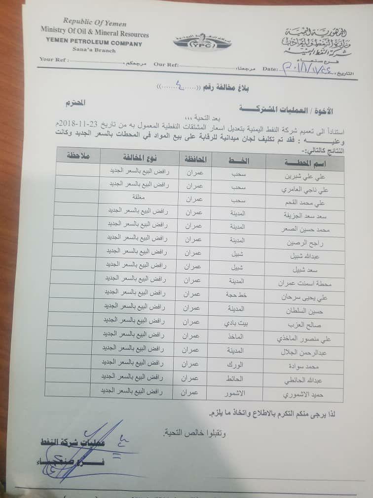 يذكر انه سبق وقامت عمليات شركة النفط فرع صنعاء في اول يوم بضبط اكثر من 67 محطة مخالفه وتم الإبلاغ عن المحطات المخالفة العمليات المشتركة ليتم إتخاذ الإجراءات اللازمه لضبط تلك المحطات.