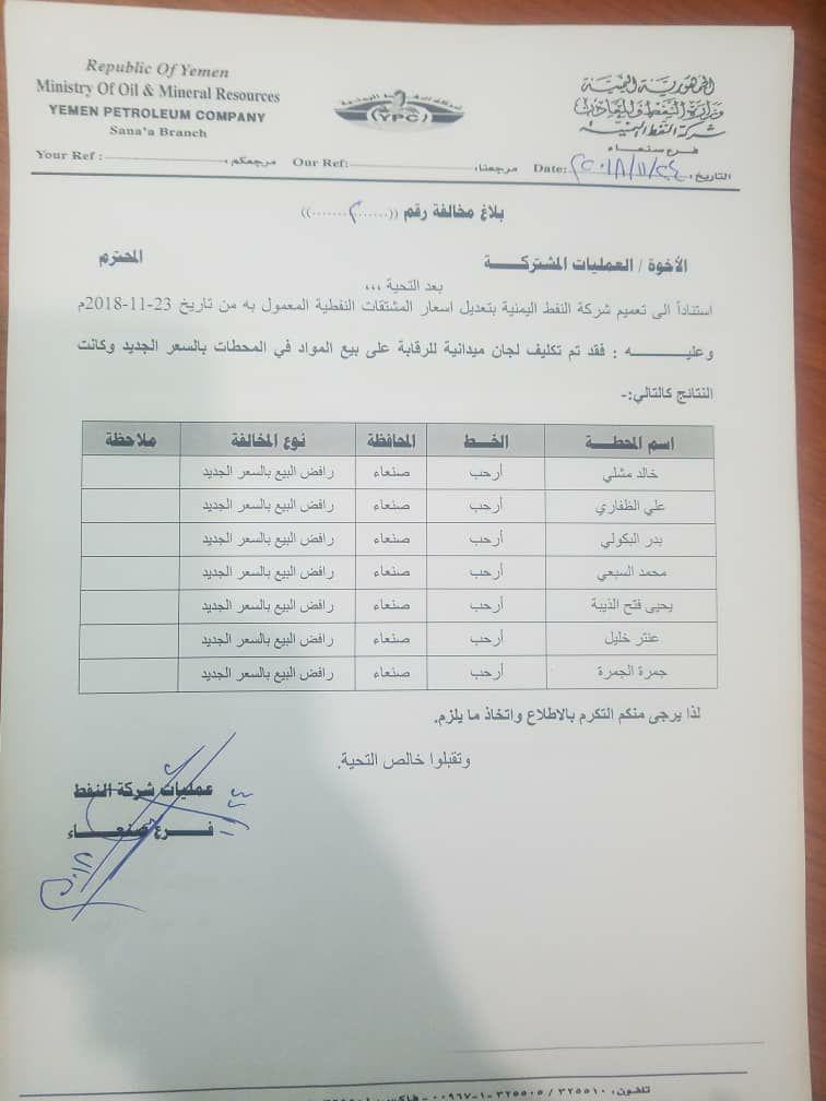 واصلت الفرق الميدانية بشركة النفط فرع صنعاء نزولها الميداني لضبط المخالفة بالتسعيرة المقره من قبل الشركة.