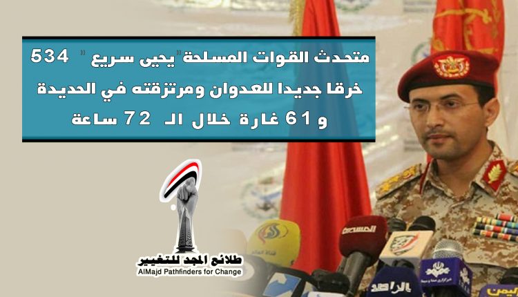 متحدث القوات المسلحة” سريع ” 534 خرقا جديدا للعدوان ومرتزقته في الحديدة و61 غارة خلال الـ 72 ساعة