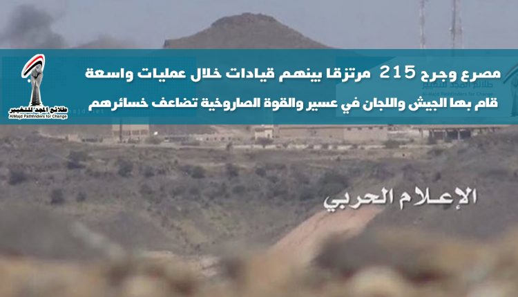 وأكد مصدر عسكري أن 215 من المرتزقة بينهم ثلاثة قيادات قتلوا وأصيبوا في عمليات مختلفة نفذها الجيش واللجان الشعبية قبالة منفذ علب في عسير.