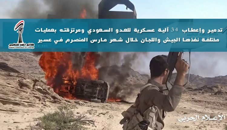تدمير وإعطاب 34 آلية عسكرية للعدو السعودي ومرتزقته بعمليات مختلفة نفذها الجيش واللجان خلال شهر مارس المنصرم في عسير