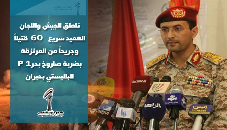ناطق الجيش واللجان العميد سريع ” 60 قتيلاً وجريحاً من المرتزقة بضربة صاروخ بدر1 P الباليستي بحيران