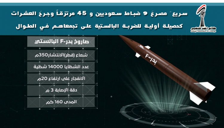 سريع” مصرعَ 9 ضباط سعوديين و 45 مرتزقاً وجرحَ العشرات كحصيلة أولية للضربة البالستية على تجمعاهم في الطوال