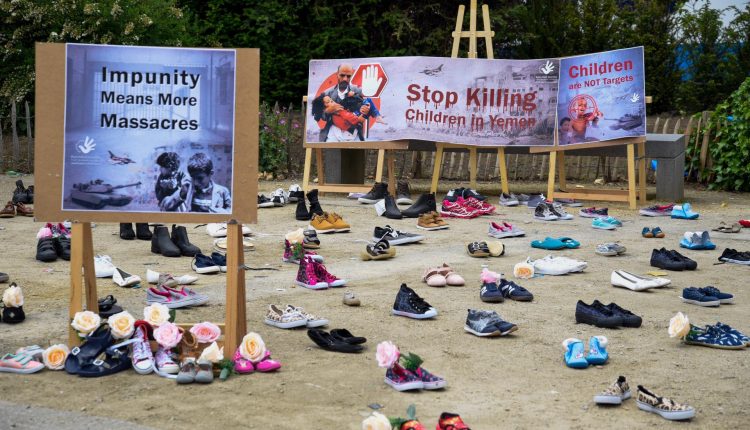 قام مجموعة نشطاء وحقوقين من المرصد الأورومتوسطي لحقوق الإنسان، بوضع مئات الأحذية في ساحة مقر المفوضية الأوروبية الواقع في العاصمة البلجيكية بروكسل ضمن احتجاجات متتالية تُنظم للتنديد باستمرار العدوان على اليمن والمطالبة بتحييد الأطفال عن النزاعات المسلحة ورفض بيع الأسلحة لدول العدوان.