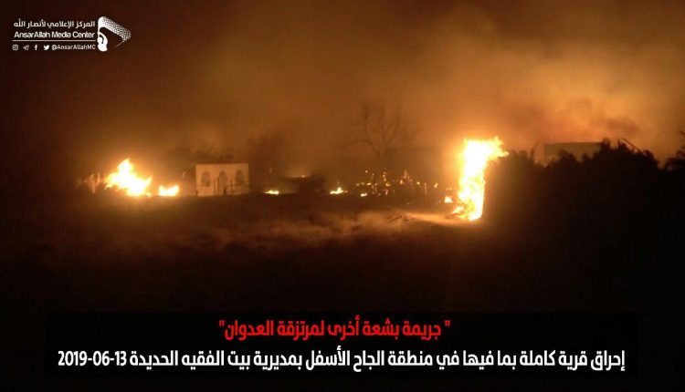 ارتكب مرتزقة العدوان يوم أمس الأول جريمة شنيعة بإحراق قرية بأكملها في بيت الفقيه بمحافظة الحديدة.