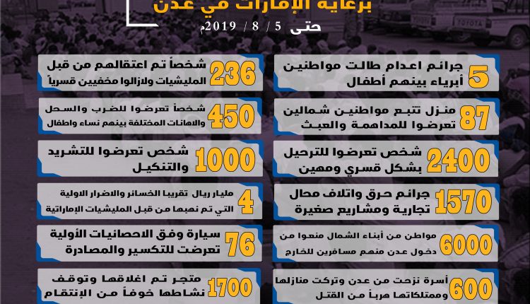 كشفت إحصائية للمركز الإعلامي للجنوب، عن إحصائية تكشف حجم المعاناة التي تعرض لها المواطنون من المحافظات الشمالية في الجنوب على أيدي المليشيات الذي تتبناها دولة الإمارات المشاركة في العدوان على اليمن، خلال العام 2019م.