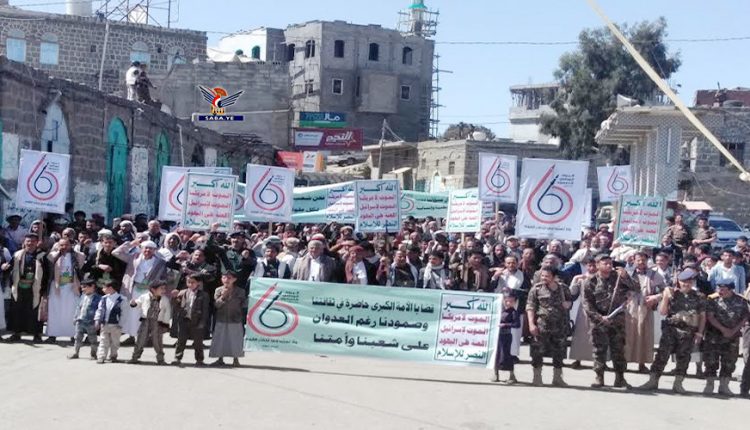 شهدت محافظة ريمة اليوم مسيرة جماهرية حاشدة وفعالية خطابية، لإحياء ذكرى مرور ستة أعوام من الصمود في وجه العدوان وتدشيناً للعام السابع.