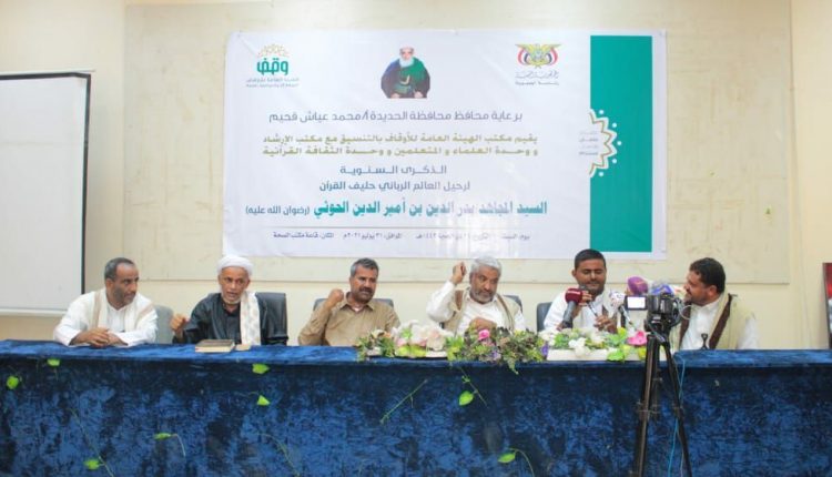 نظّم مكتب الهيئة العامة للأوقاف ووحدتا العلماء والمتعلمين والثقافة القرآنية بمحافظة الحديدة اليوم فعالية خطابية لإحياء الذكرى السنوية لرحيل العالم بدر الدين بن أمير الدين الحوثي.